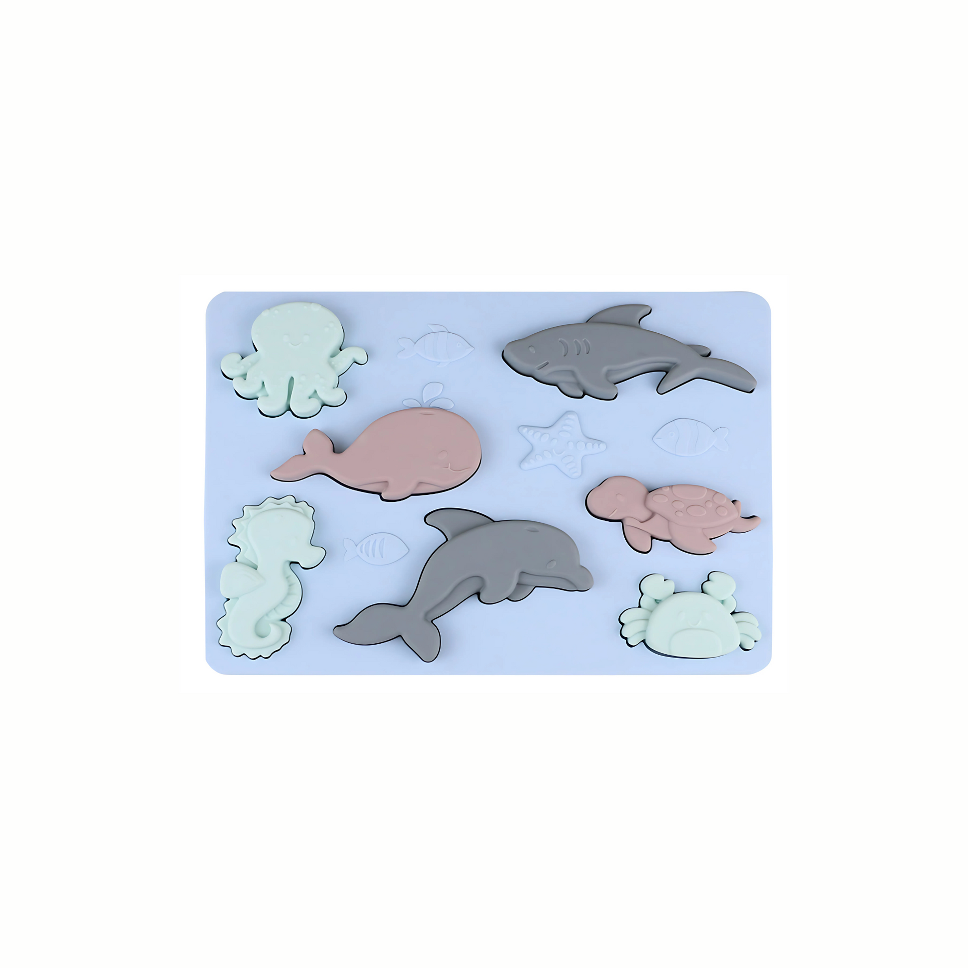 Dive into an ocean of tactile fun with our engaging Silicone Sea Creatures Puzzle! This delightful puzzle features a sturdy base with recessed shapes and a collection of smooth, squishy silicone sea creature pieces perfectly sized for little hands to grasp and fit into their corresponding spots. Crafted from safe, food-grade silicone, this eco-conscious puzzle encourages the development of fine motor skills, hand-eye coordination, and sea creature recognition in a safe and stimulating way. The varied textures of the silicone pieces add an extra layer of sensory exploration, making learning about the ocean both fun and tactile!